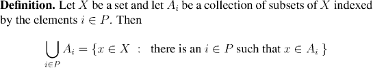 From the picture it's clear that we can view S as a sort of union of the sets (1/(2n+1), 1/2n). But how can we talk about the union of infinitely many sets? (Note) In fact, taking the union (or intersection) of infinitely many sets will be important at many points through the course, so we now take a minute to give a careful definition of what it involves.