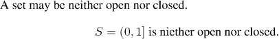 We can construct a very interesting closed set called the "Cantor middle-1/3 set" by starting with the closed unit interval [0, 1] and repeatedly removing the middle 1/3 from each of the intervals left over from the previous step. The result of the process is the set remaining after all the open intervals in this (infinite) process have been removed.