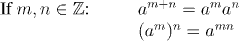 Exponentiation by an integer exponent has the following properties: