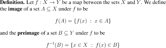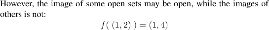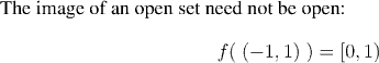 Note that the preimage of an open set under a continuous function is open, but that the image of an open set need not be. The next example illustrates this.