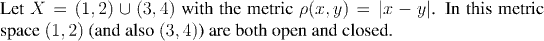 The set (1,2) can be viewed as a subset of both the metric space X of this last example, or as a subset of the real line. Clearly (1,2) is not closed as a subset of the real line, but it is closed as a subset of this metric space. The lesson of this, is that whether or not a set is open or closed can depend as much on what metric space it is contained in, as on the intrinsic properties of the set.
