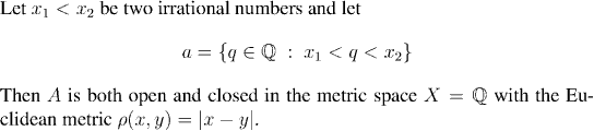 This means that being open or closed are not mutually exclusive alternatives. You could say that openness and closedness are opposite concepts, but the way in which they are opposites is expressed by Proposition 5.12. Because the whole space and the empty set are always open and closed, they are said to be trivial examples of sets which are both open and closed.