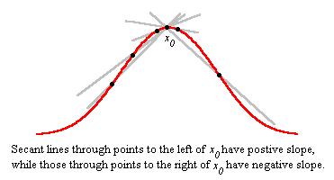 The picture shows the key idea of the lemma's proof, that the slope of secant lines to the right of the maximum is negative and to the left of the maximum is negative. Since these slopes must converge to a common value, the limit must be zero.